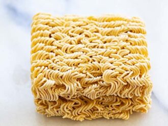 Noodles are a type of staple food that is made from unleavened dough, typically consisting of wheat flour, water, and sometimes eggs. They are a popular food item in many cultures and can be found in various forms, such as instant noodles, ramen noodles, and pasta. Noodles are versatile and can be cooked in different ways, making them a convenient and widely consumed food product.